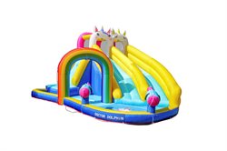The material is PVC nylon with reinforced seams. Top-notch quality for many, many hours of fun for children. Quick to set up, the included blower plugs into the socket, and in just 2 minutes, it’s ready for use.