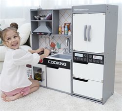 Our large wooden play kitchen for children aged 3-8 years is designed to be more engaging and interactive than regular plastic kitchens. That’s why it’s bigger, taller, and comes with many more movable parts and accessories in each package. Simply add AA and AAA batteries (not included), and they’ll be able to turn on the stovetops, create sounds from the range hood, and much more. Meanwhile, the entire experience is enhanced with kitchen tools, spice bottles, and plenty of appliances that make them feel like they’re in the kitchen with mom and dad.